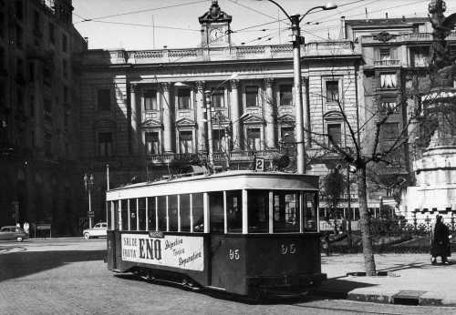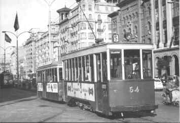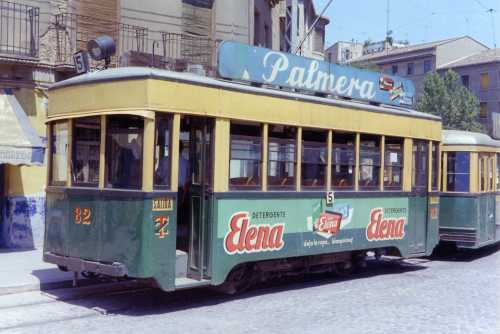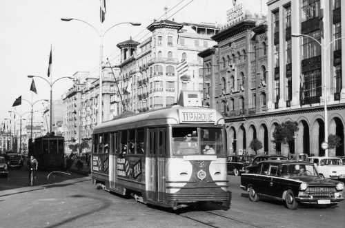 Bazebiltzan ere, kotxe kopuruak artean hala uzten baitzuen, koloretako tranbiak, lurzoruan sartutako burdinbide mehar paraleloen gainean. Gehienek bi bagoi zituzten, lehenbizikoak motorea zeraman, itxura hauskorreko pantografoa, gidariaren tokia eta bidaiarientzako eserlekuak, bigarrena soilik bidaiarientzako zen. Hiriaren erdigunean, asfaltoaren ordez oraindik galtzada-harria mantentzen zuten kaleetan, periferiatik zetozen tranbia-linea desberdinak elkartzen zihoazen, eta tranbien kopurua kaleetan handitzen. Geltokietan bi edo hiru tranbia egon zitezkeen aldi berean; handik ateratzean lehenak eskuinetara joko zuen, bigarrenak ezkerretara, eta ordurako egongo zen besteren bat haien lekua hartu nahian.